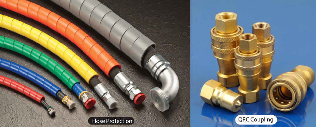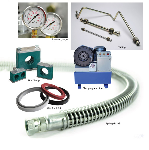 Accessories are useful for further enhancements or added protection. Like any products, hydraulic and industrial hoses also need additional support from accessories. Therefore, we purvey miscellaneous accessories such as hose protection, QRC coupling, pressure gauge, tubing, seal and O ring, clamping machine, pipe clamp, as well as spring guard.